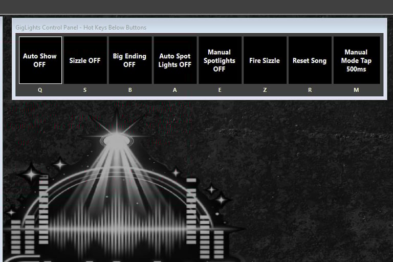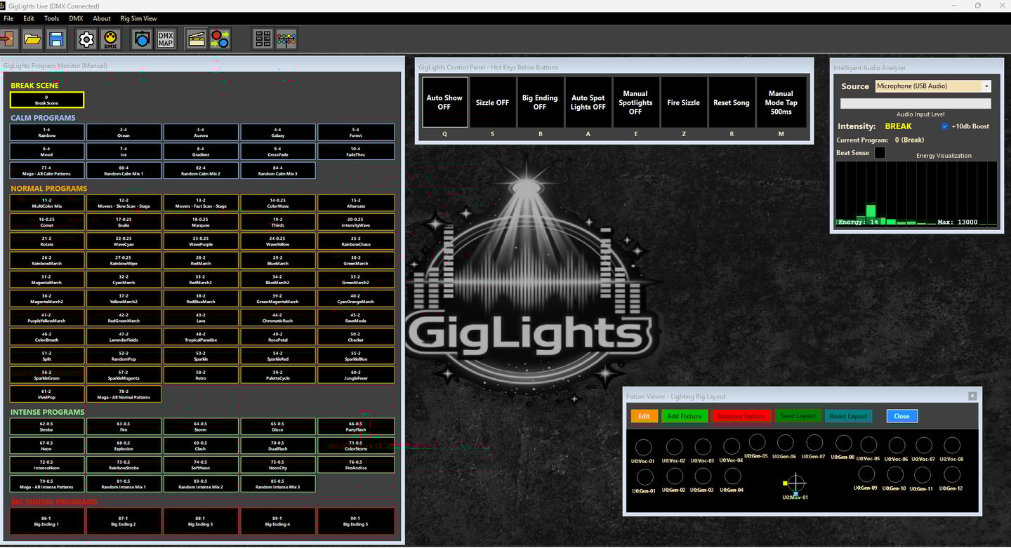 Once you click the "Auto Show" button, GigLights will start listening to your music and analyze it. It will almost instantly pick up on the beat and the energy of what you are playing.