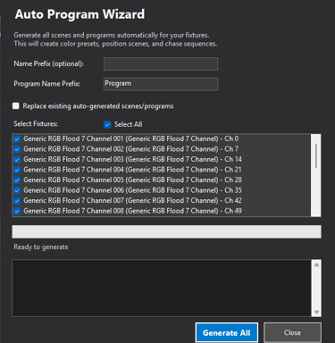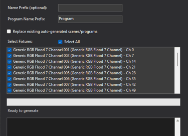 After you have your DMX map, it's time to make programs. GigLights has a Program Wizard to create over 500 scenes to be used by Auto Programs (that will also be created by the Program Wizard). This is a huge time saver for you. Scenes contain groups of fixtures with colors or functions. Programs contain groups of scenes. But this is all done for you with the Wizard.