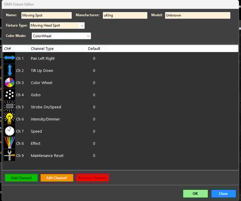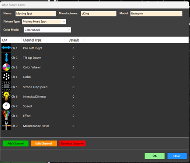 This fixture definition is a more complex one. Most RGB flood fixtures are a lot easier requring just 7 or less channels.