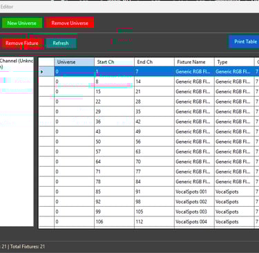 After you create your fixtures, you need to create a DMX map of them. This is super easy. You already have your fixture types defined so you just pick one of your fixtures and put it into the map as many times as you have fixtures. If you have say 7 "generic rgb floods", put that fixture into the map 7 times. GigLights will assign the DMX address in the map. When done, just print out the DMX map and set the DMX addresses on your fixtures.